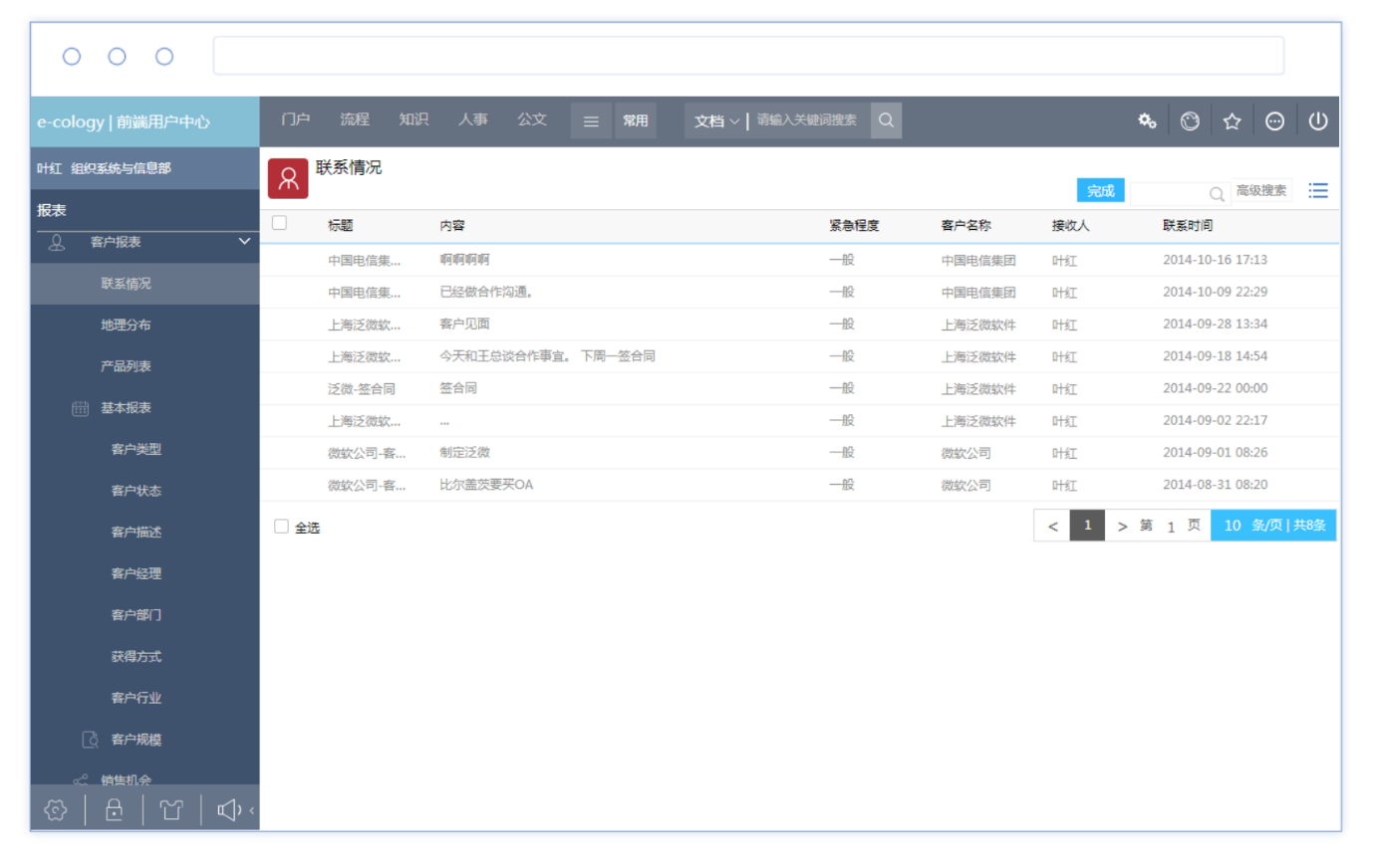 ![]() (点击放大) → 获得客户信息后,全方位录入客户信息,调整客户卡片 ![]() (点击放大) 5. 通过e-cology的CRM模块和财务模块的结合,销售人员可以全面掌握和客户发生的所有费用和财务状况。 → 查看和客户相关的合同执行情况 (点击放大) → 通过合同提报,实时检阅销售的商机转化率和合同质量 ![]() (点击放大) → 通过发票开具以及收款情况控制,即时了解合同确认情况 ![]() (点击放大) 6. 通过客户的新建对比,系统可以将相近或者相同的客户记录提取出来,避免了客户资源的重复,给客户造就良好的企业形象 7. 通过e-cology的联系记录和联系计划,管理层可以了解到公司销售部门的最新的进展。 → 销售部的客户联系记录管理 ![]() (点击放大) → 销售部的客户联系提醒 ![]() (点击放大) 8. 动态的绩效评估,帮助销售经理完成销售部门的考核 → 月工作的评分管理,部门经理动态的考核销售部 ![]() (点击放大) → 客户的定量分析管理,使销售的考核更加全面,统计固定时间内的联系情况 9. 协同的知识管理,实现了经验和知识的快速分享,帮助企业隐性的知识快速转化为显性的知识,企业的知识不在躲藏在死角。 → 知识地图的创建和管理,实现员工对企业文化,专业技能的迅速了解和掌握 ![]() (点击放大) → 隐性的知识通过挖掘,实现了向显性知识的转换,每个客户跟踪的记录都被提取出来成为经验得到分享。 ![]() (点击放大)